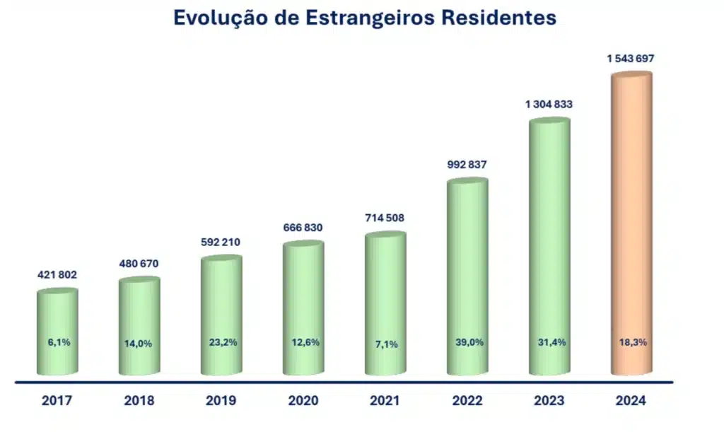 Até o final de 2024, a população estrangeira residente em Portugal atingiu 1.543.697. Este número representa um crescimento de quase quatro vezes em comparação com os 421.802 registados em 2017.Apenas em 2024, a população residente estrangeira teve um crescimento de 18,3%, demonstrando que a atração de Portugal — para imigração, investimento e novos residentes — não está a diminuir, mas sim a acelerar consistentemente. Estes dados antecipam cenários que se refletem nas estatísticas imigração Portugal 2025, confirmando a tendência de crescimento contínuo.