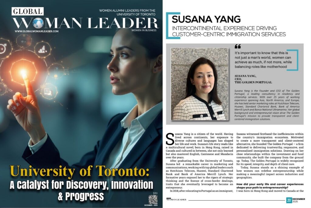 在激励人心的全球女性领袖专题中,The Golden Portugal(金葡咨询) 创办人兼执行长 Susana Yang 被评选为多伦多大学十大女性校友领袖。这项荣誉不仅表彰了她在移民服务行业的远见,更肯定了她对全球移居者带来的变革性影响。