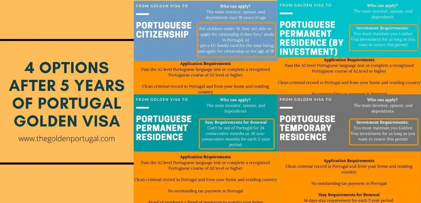 這是葡萄牙黃金簽證後續的完整指南,我們將詳細介紹上述每個類別,為您提供有關獲得和維持公民身份或永久居留身份要求的資料,例如逗留要求、投資要求、語言測試、更新頻率和費用。